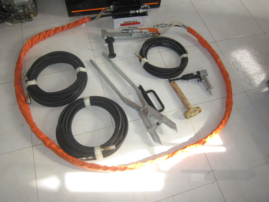 Venta y alquiler de kit de herramientas y desmontaje de protectores de cable. Consta de pistola neumática para trabajo pesado, bomba hidráulica de 10.000 PSI con control remoto, unidad de mantenimiento y dispositivos de cierre manual y automático endurecidos con tratamiento térmico. Mantenimiento de unidades para instalación de bandas (Signode y Fromm)